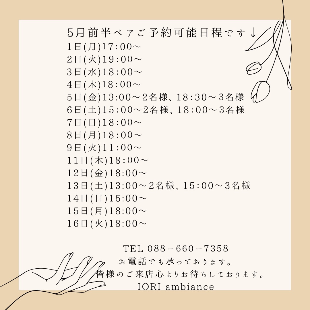 5月前半の2名様、3名様同時ご予約日程のご案内です↓↓